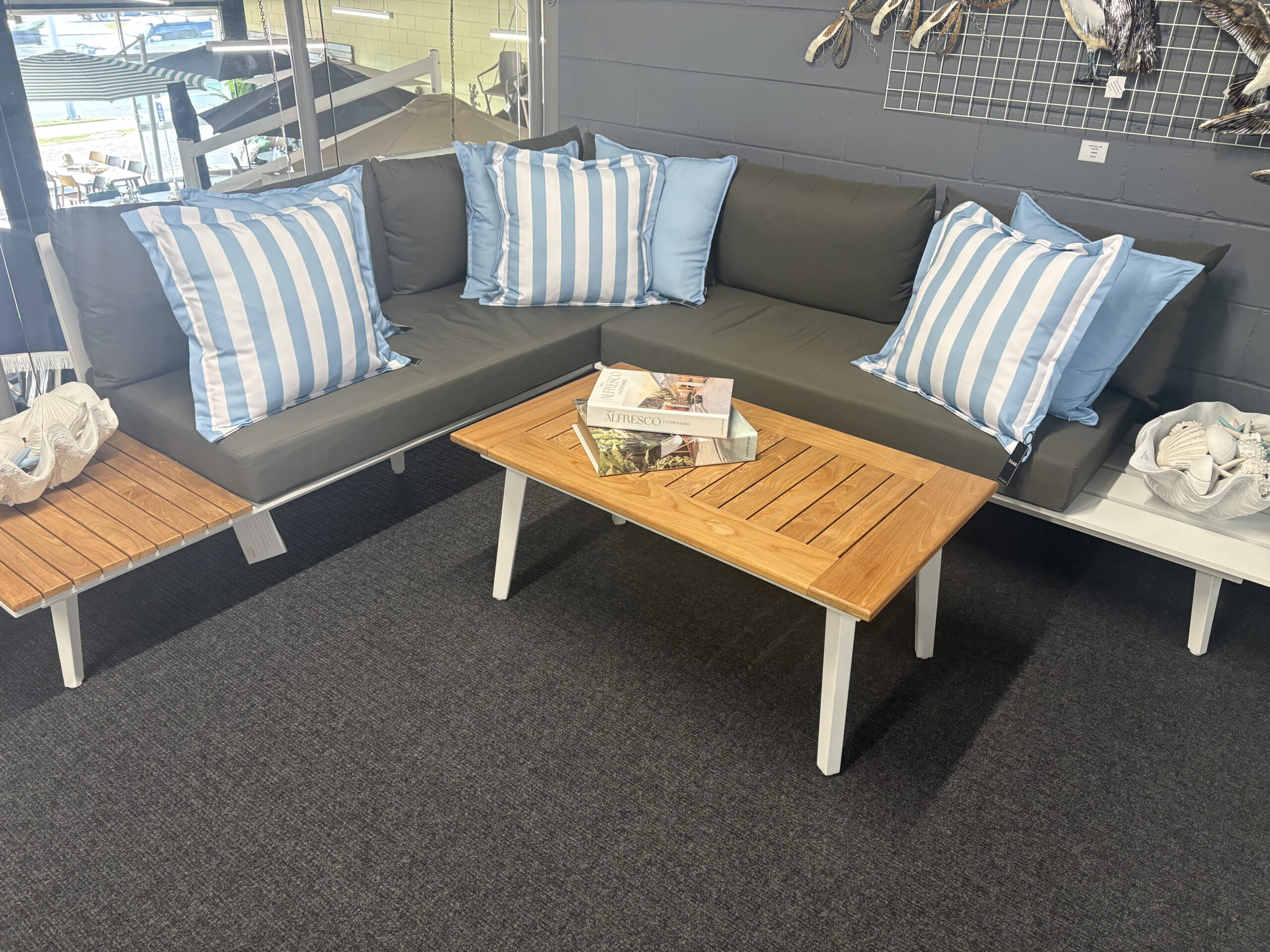 This is a quality aluminium modular setting with stainless steel fittings and sunproof fabric cushions. It includes 1 x 2 Seater with coffee table extension, 1 x 3 Seater with coffee table extension and a unique teak top tapered coffee table 100x60cm. DISPLAYED SPECIAL IS IN WHITE FRAME. (Note Teak tray featured in photo on 1 table extension is optional extra).