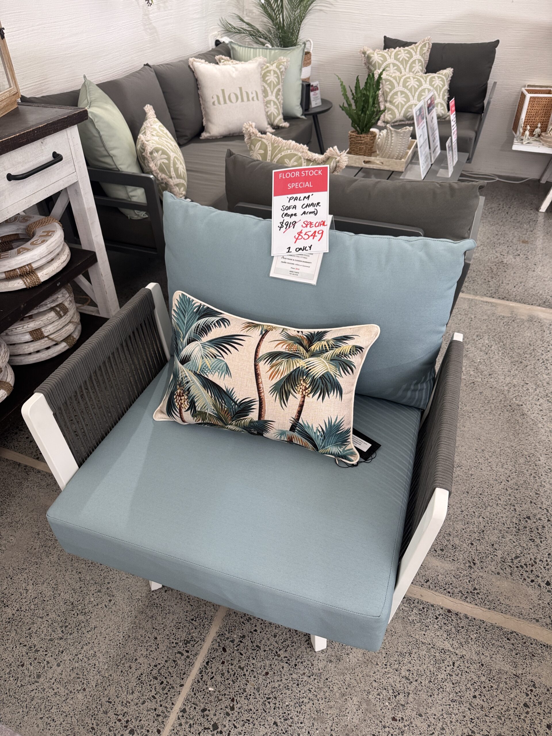 Made from quality aluminium with stainless steel fittings and only the best Sunproof cushions. The olefin rope arms are a standout. This is currently being sold as a ONE OFF Floor stock Special on it’s own. Available at our Noosa store.
