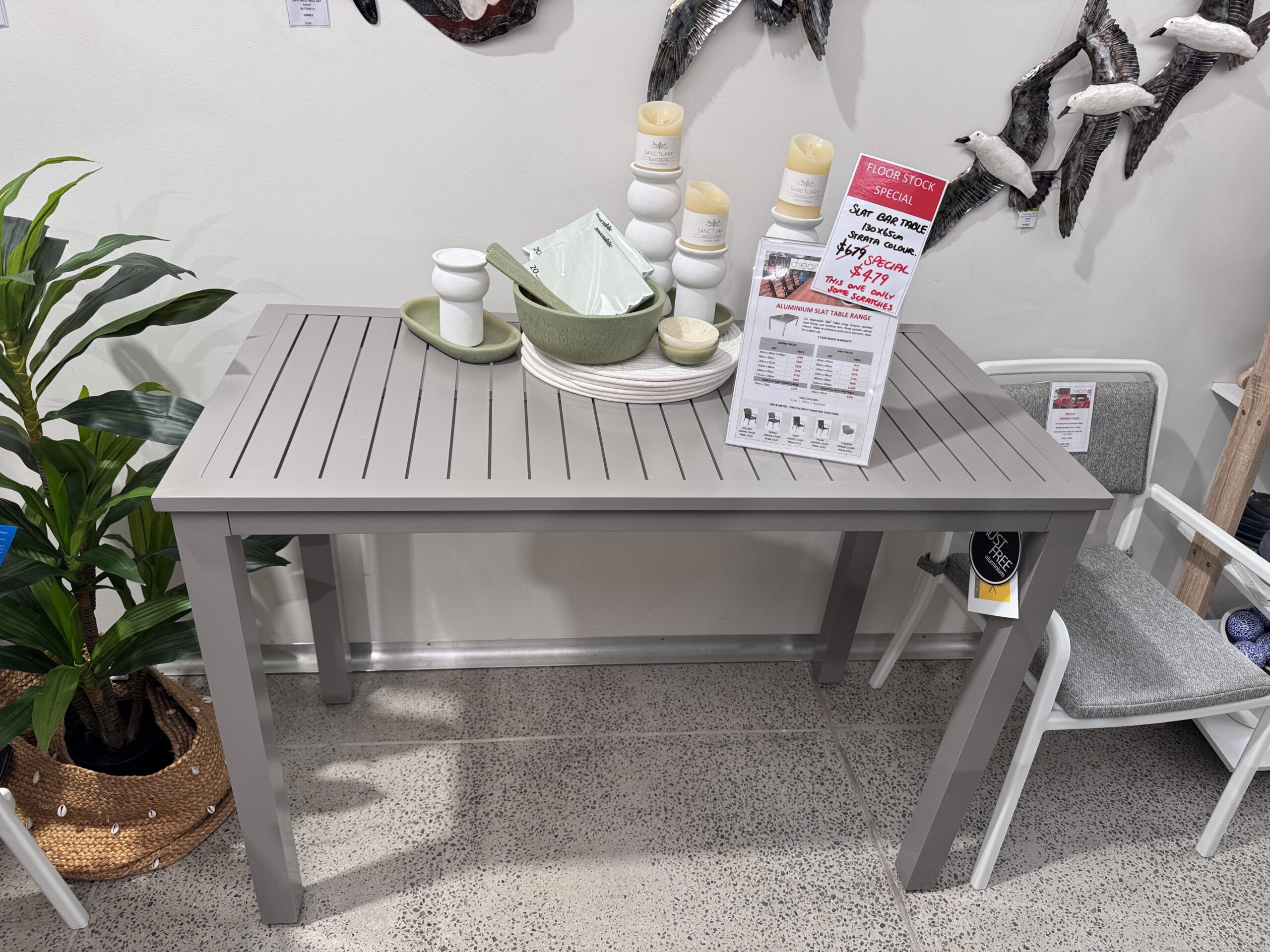 This Slat Bar Table in Strata colour is a floorstock clearance at our Noosa store. One only. A great compact bar table. This table is available in 3 colours and many sizes, but only this one is on clearance.